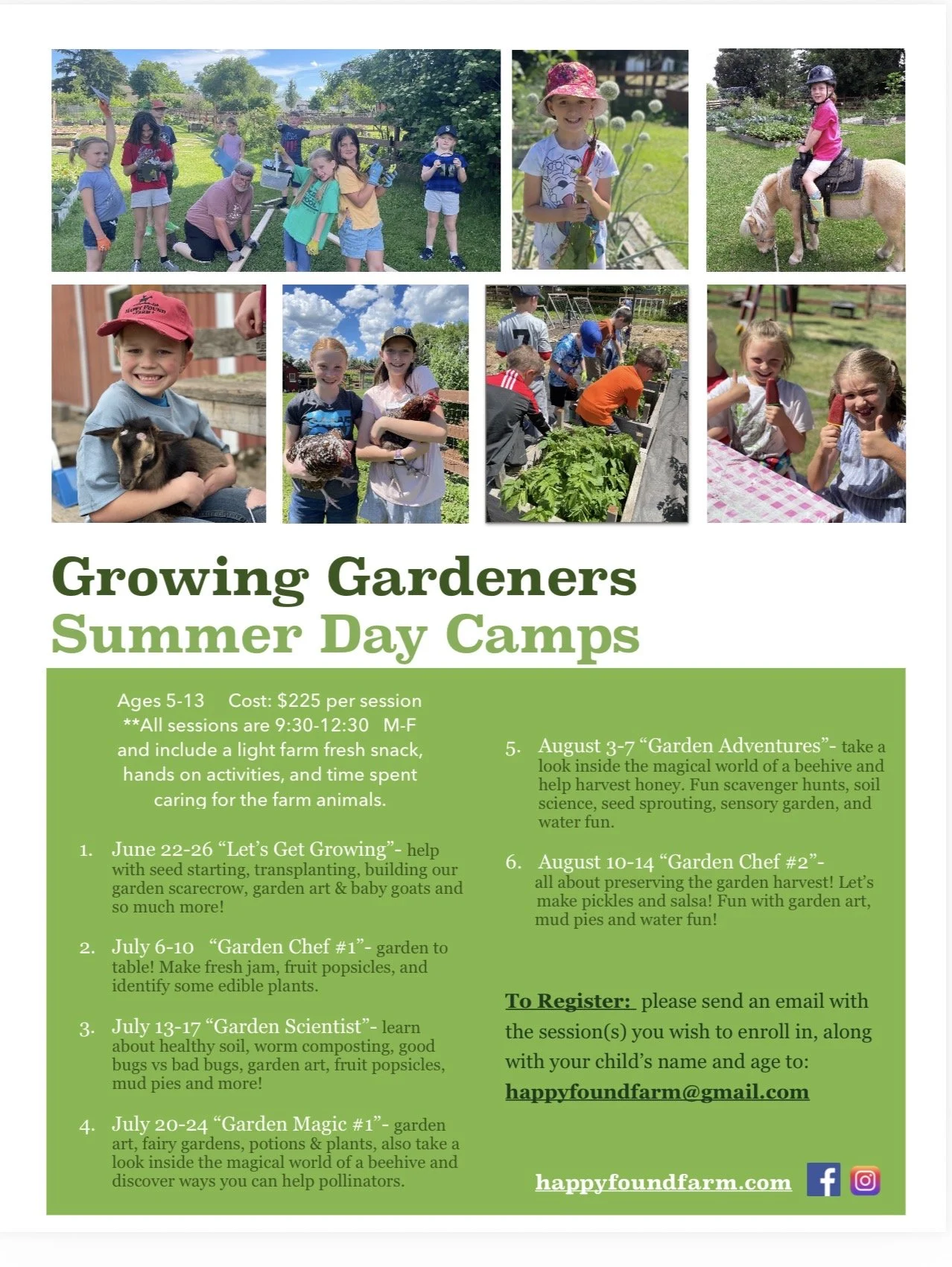 To register: please send an email to happyfoundfarm@gmail.com with the session dates you would like to reserve, along with your child’s name and age.